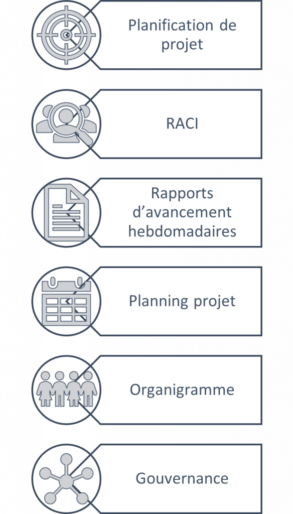 - La mise en place et l’animation de rituels de pilotage structurés (comités projet, comités de pilotage, points hebdomadaires), avec un niveau d’information adapté aux instances exécutives,